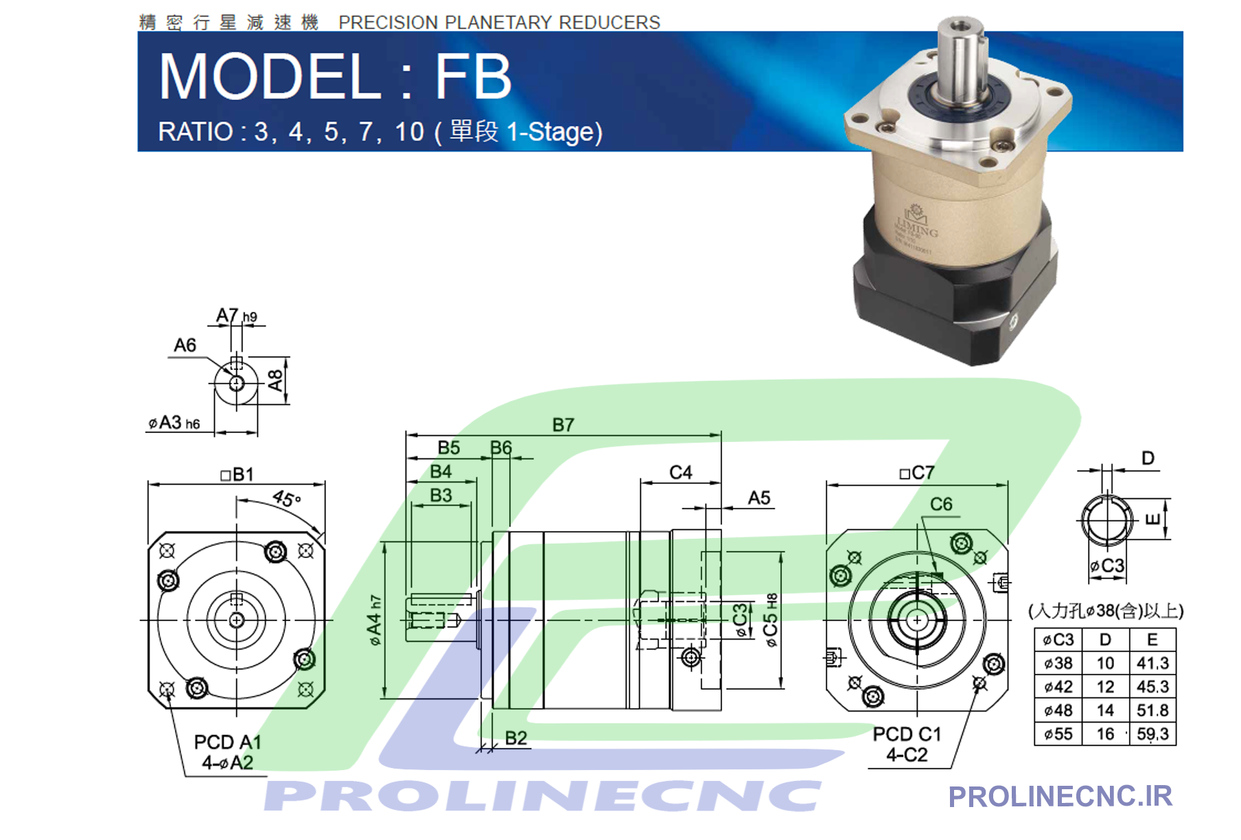 گیربکس خورشیدی 50 نسبت 1 به 10 شفت ورودی 8 فلنج مربع مدل FB50-10 لیمینگ تایوان (مناسب سروو 100 وات 3000 دور)