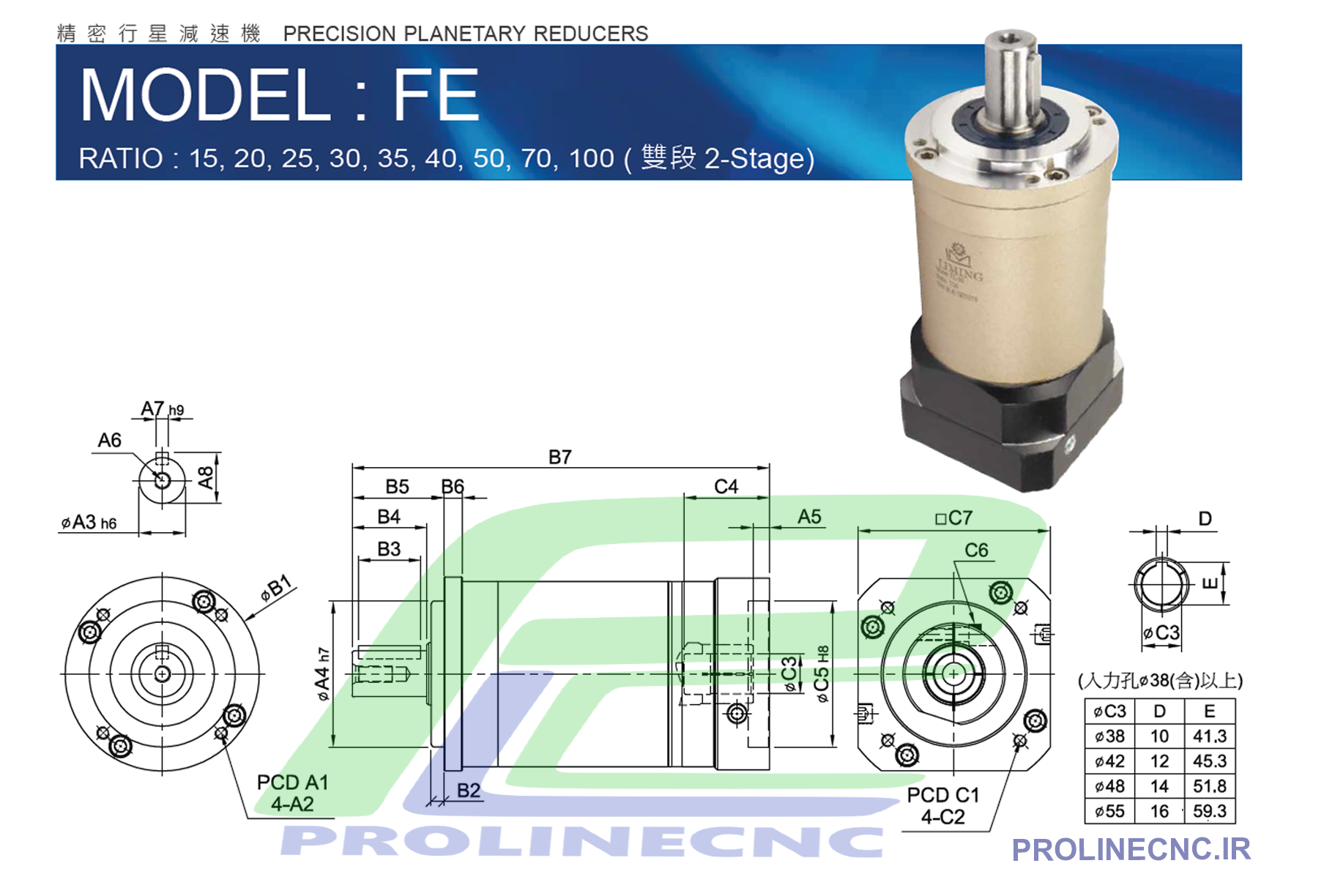 کاتالوگ گیربکس 70 خورشیدی نسبت 1 به 100 مدل FE70-100 شفت ورودی 14 شفت خروجی 16 فلنج گرد مناسب سروو 400 وات 3000 دور