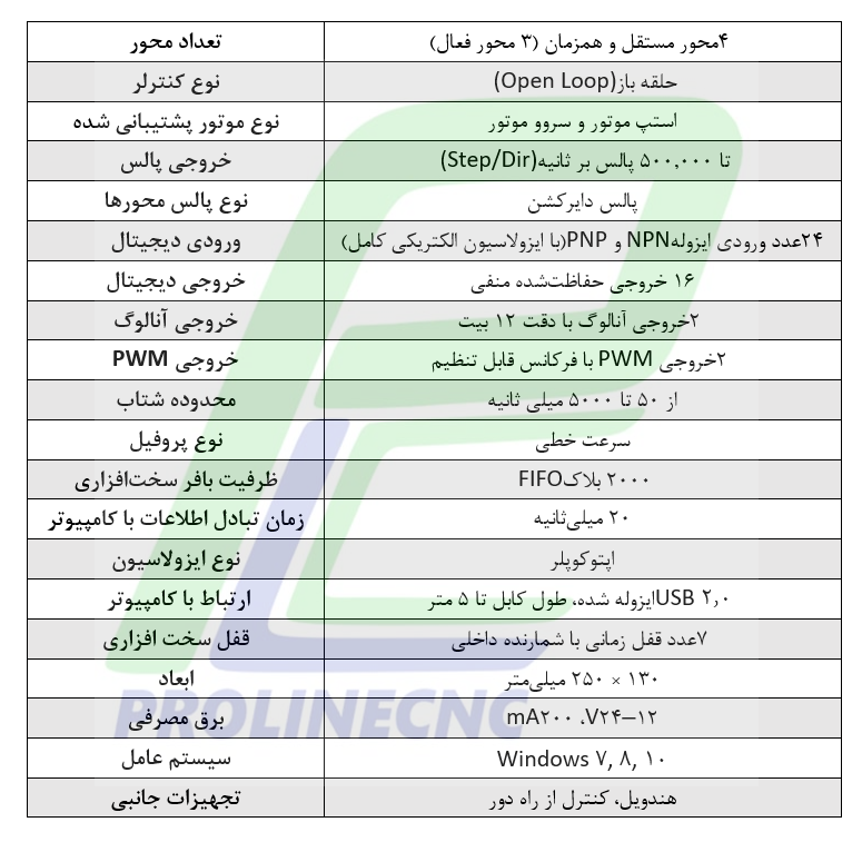این کنترلر قادر است تا ۴ محور مستقل و همزمان را مدیریت کند و سه محور آن بهصورت فعال برای استپ یا سروو موتور قابل استفاده هستند.